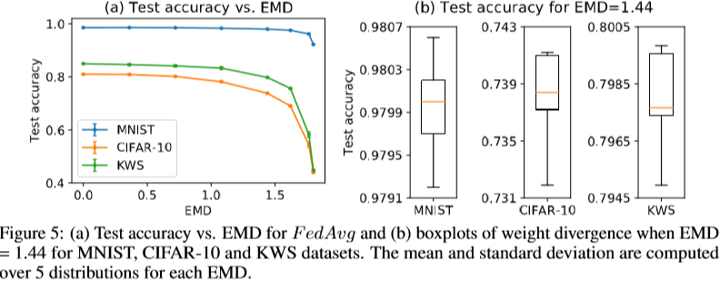 对于每个EMD,在相同的5个分布上计算出测试精度的平均值和标准偏差。结果总结在表2中,并相对于EMD绘制在图5中。对于所有三个数据集,测试精度随EMD降低。首先,降低的速率相对较小,随着数据变得更加non-IID而降低。因此,在将non-IID数据与IID平衡与提高FedAvg的准确性之间需要权衡。图中的误差线表示由于每个EMD的各种分布而导致的测试精度变化。为了更仔细地观察变化,方框图显示了EMD = 1.44时5次运行的测试准确性。此外,表2显示,MNIST的最大变化小于0.086%,CIFAR-10的最大变化小于2%,KWS的最大变化小于1%。因此,精度受EMD而非基础分布的影响。它表明,在给定数据分布的情况下,EMD可用于估计FedAvg的准确性。此外,MNIST的准确性最大降低为6.53%,CIFAR-10的准确性为37.03%,KWS的准确性为40.21%。这种差异可能受方程式中梯度的影响。 (2)视问题本身而定。