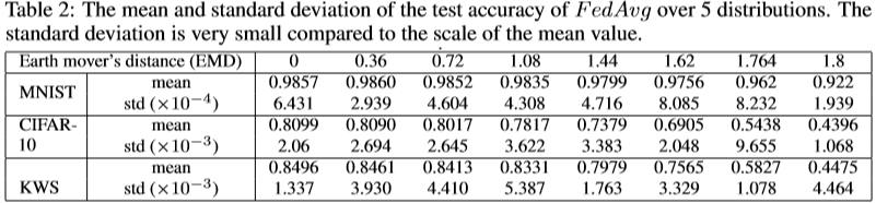 训练集被分类并划分为10个客户端,每个客户端M个示例。表2中列出的EMD选择了八个值。因为一个EMD可能存在各种分布,所以我们旨在生成五个分布来计算weight divergence和测试精度的平均值和变化。首先,为一个EMD生成一个10个类上的概率分布P。基于M和P,我们可以为一个客户机计算10个类上的实例数量。其次,通过将P的10个概率移动1个元素,生成一个新的分布P’。可以基于P’计算第二个客户端的示例数。对其他8个客户端重复此过程。因此,所有10个客户端在10个类中分布了M个示例,每个示例仅使用一次。最后,将上述两个步骤重复5次以为每个EMD生成5个分布.CNN由FedAvg进行了500多次通信回合,对上述过程中处理的数据进行训练。 有用于训练的关键参数:对于MNIST,B = 100,E = 1,η= 0.01,衰减率= 0.995; 对于CIFAR-10,B = 100,E = 1,η= 0.1,衰减率= 0.992; 对于KWS,B = 50,E = 1,η= 0.05,衰减率= 0.992。weight divergence是根据等式计算的。 (1)1次同步后(即1个通信回合)。