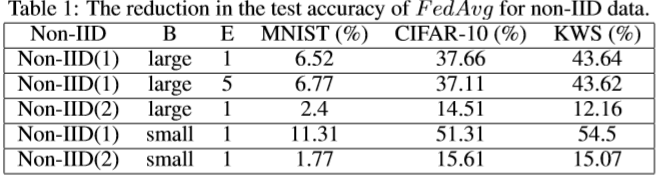 除了通信方面的挑战,联邦学习还面临着统计方面的挑战。联邦学习依赖于随机梯度下降法(SGD),该方法被广泛用于训练具有良好经验性能的深度网络[12,13,14,15,16,17]。训练数据的IID抽样对于确保随机梯度是全梯度的无偏估计非常重要[15,16,18]。在实践中,假设每个边缘设备上的本地数据总是IID是不现实的。为了解决non-IID挑战,Smith[28]等人提出了一个多任务学习(MTL)框架,并开发了MOCHA来解决MTL中的系统挑战。但是这种方法与以前关于联邦学习的工作有很大的不同。McMahan等人[3]已经证明FedAvg可以处理某些non-IID数据。然而,正如我们将在第2节中展示的,在non-IID数据高度倾斜的情况下,使用FedAvg算法训练的卷积神经网络的精度可以显著降低,对于MNIST数据集高达11% 、对于CIFAR-10数据集达51% 、keyword spotting(KWS)数据集达55%。