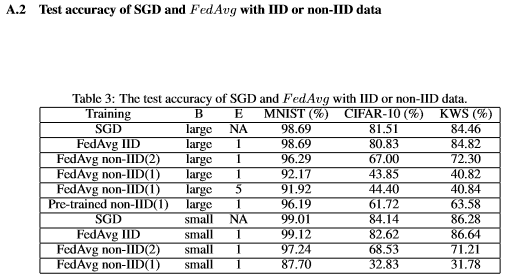 我们对FedAvg算法使用与[3]相同的表示法:B,the batch size; E,the number of local epochs。以下参数用于FedAvg: MNIST, B = 10和100,E = 1和5,η= 0.01 ,衰减率decay rate = 0.995;对于CIFAR-10:B = 10和100,E = 1 和5,η= 0.1,衰减率decay rate = 0.992;对于KWS, B = 10和50,E = 1和5,η= 0.05和衰减率decay rate = 0.992。学习率针对每个数据集进行了优化,并在通信回合中呈指数衰减。对于SGD,学习速率和衰减速率是相同的,但是B要大10倍。这是因为来自FedAvg的全局模型在每次同步时在10个客户机上取平均值。使用IID数据的FedAvg应该与使用移动数据的SGD进行比较,batch size是后者的K倍,其中K是每次同步FedAvg时包含的客户端数量。