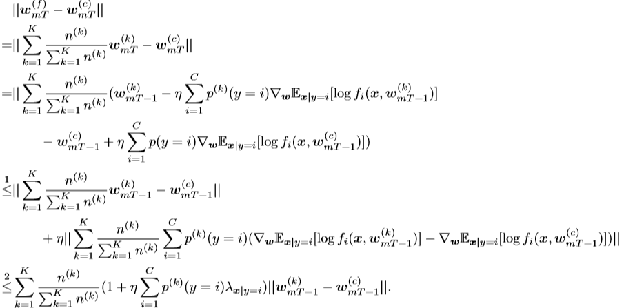 在联邦学习中我们假设有K个客户端。令n(k)表示数据量,p(k)表示客户端k∈[k]上的数据分布。在每个客户端,本地SGD分别执行。在客户端k∈[k]上的迭代t时,本地SGD执行
