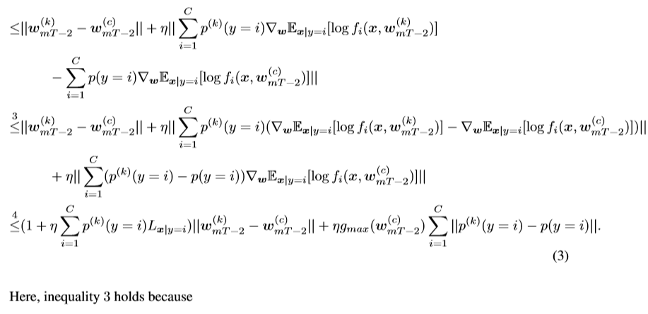 Remark3.2. 第m次同步后的weight divergence主要来自两个部分,包括(m-1)次divergence后的weight divergence,即 。以及与实际分布相比,由客户端k上的数据分布的概率距离引起的weight divergence,即