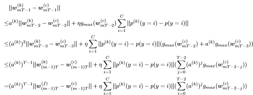 然后,假设每T步都进行一次同步,令 表示第m次同步后计算的权值,则有