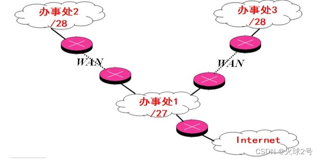 第一办事处:32 个地址,则主机号占 5bit,分配地址掩码为/27; 第二、三办事处:各 16 个地址,则主机号占 4bit,地址掩码为/28;