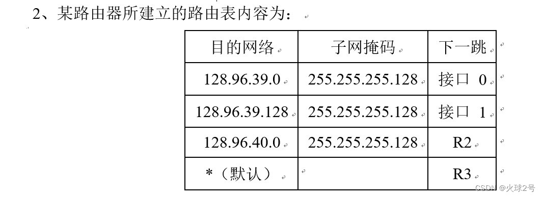 (3)目的 IP 地址:128.96.40.151 与掩码:255.255.255.128,相与运算,得出目的网络地址:128.96.40.128,选择默认路由,所以下一跳为:R3
