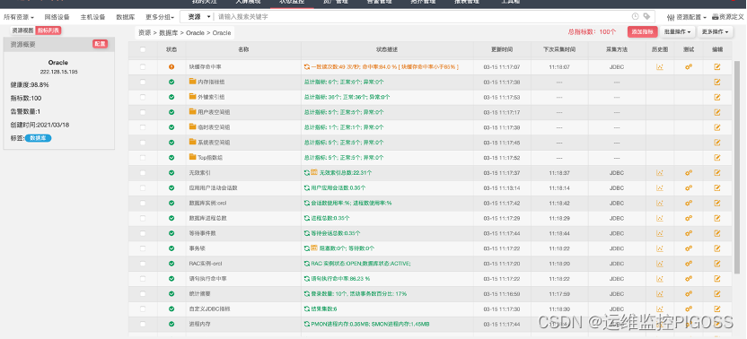 PIGOSS的BSM监控管理工具中的数据库模块,提供了几乎涵盖所有类型数据库的监控工具,同时支持部分国产数据库,这个工具的界面十分易用,可以帮你快速、轻松地查找问题。可以在主屏幕上查看数据库实例、等待时间、CPU(带有警告和关键警告)、内存、磁盘和会话、RAC实例以及ASM磁盘等信息。