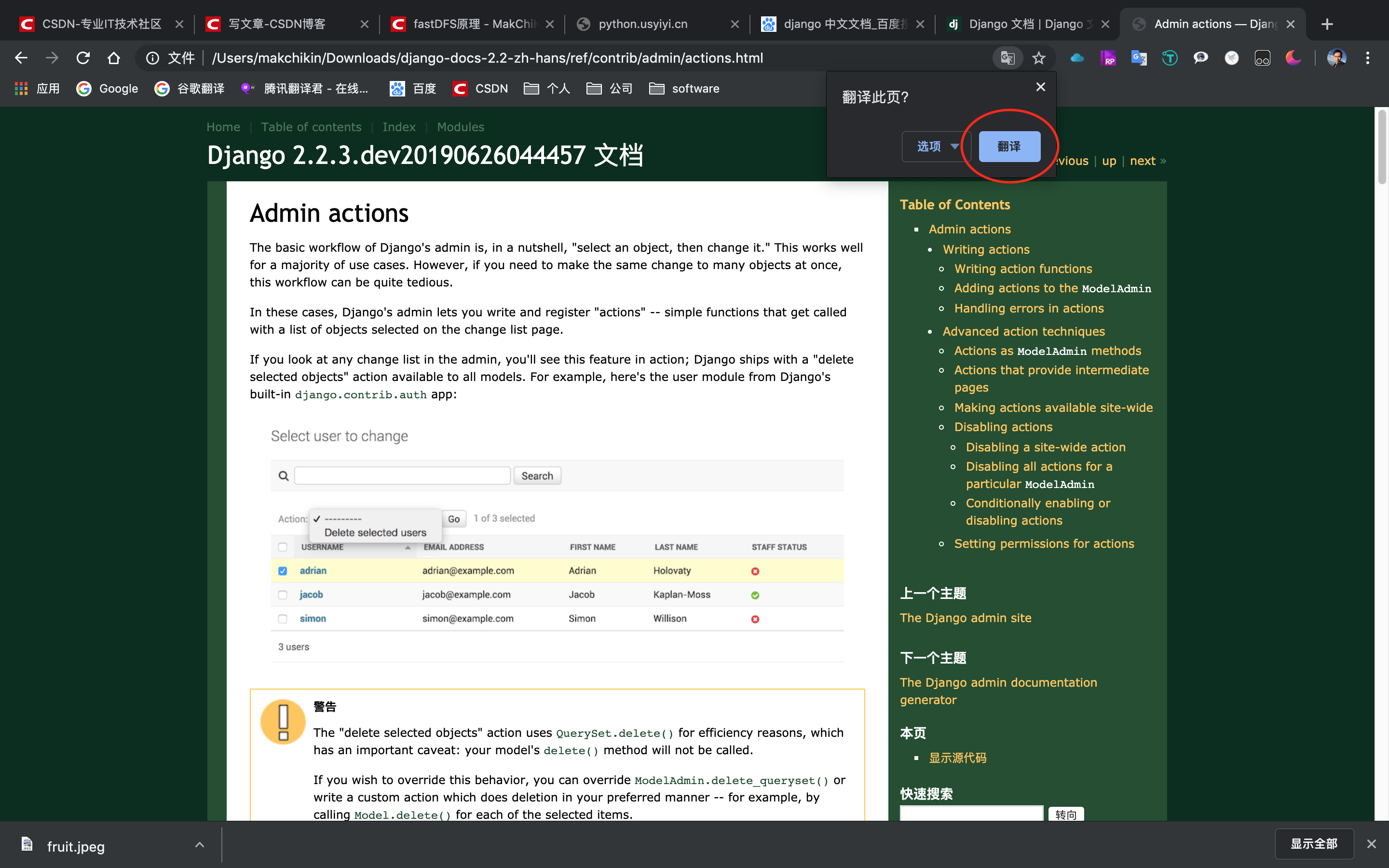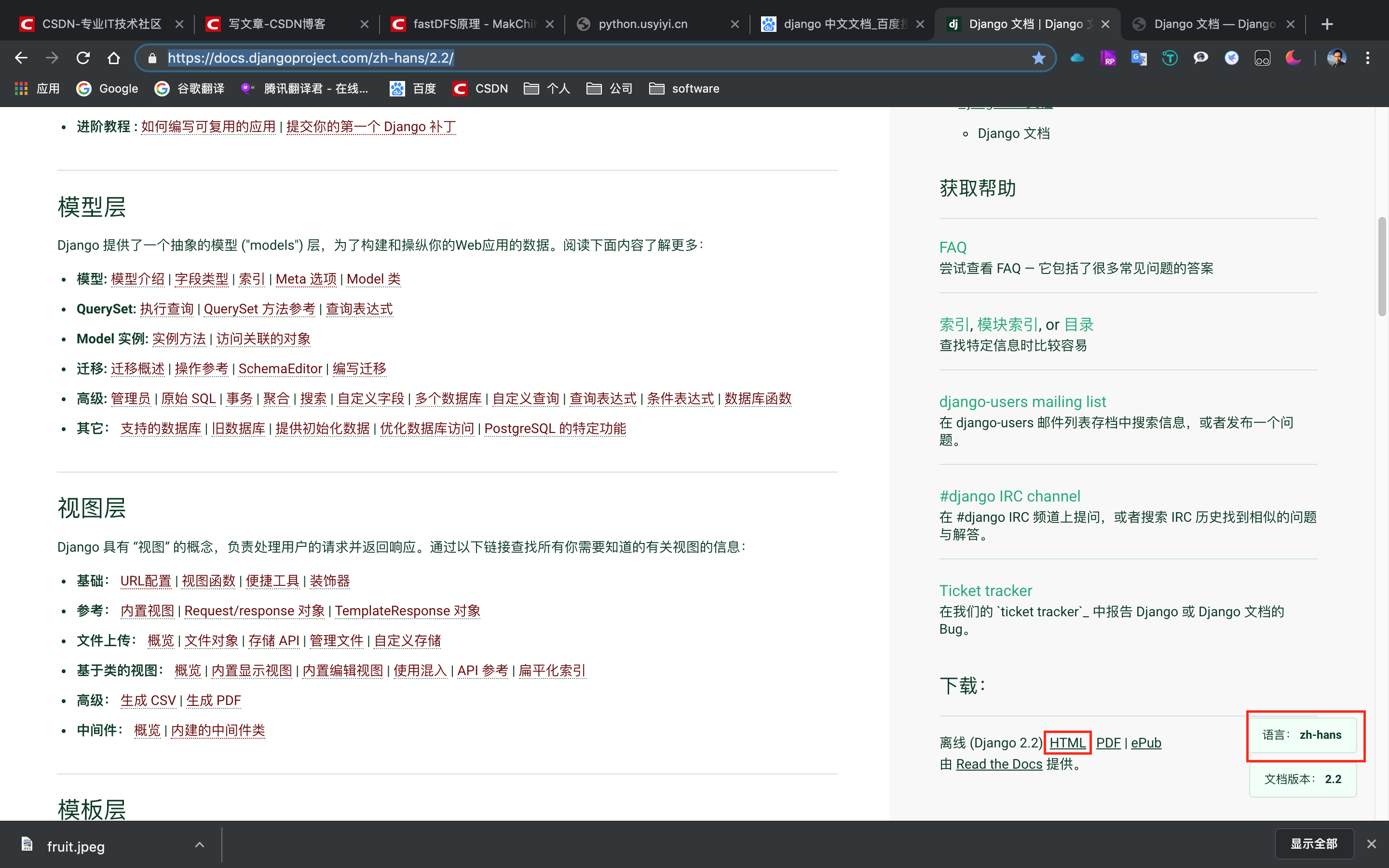 点击?地址,2.2是版本号,后续更新需自行更改对应的版本 https://docs.djangoproject.com/zh-hans/2.2/ 点击下载 HTML,即可下载全中文官方文档 有部分没有中文翻译的页面,请自行安装谷歌翻译插件