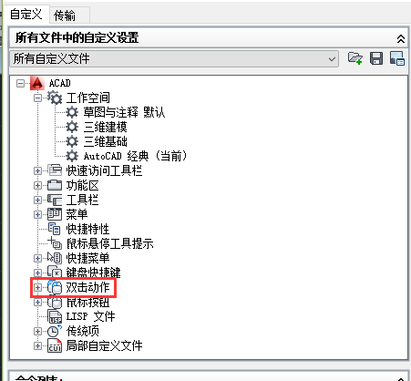 CAD本身为我们提供的双击事件的设置。工具-工作空间-自定义...打开用户自定界面