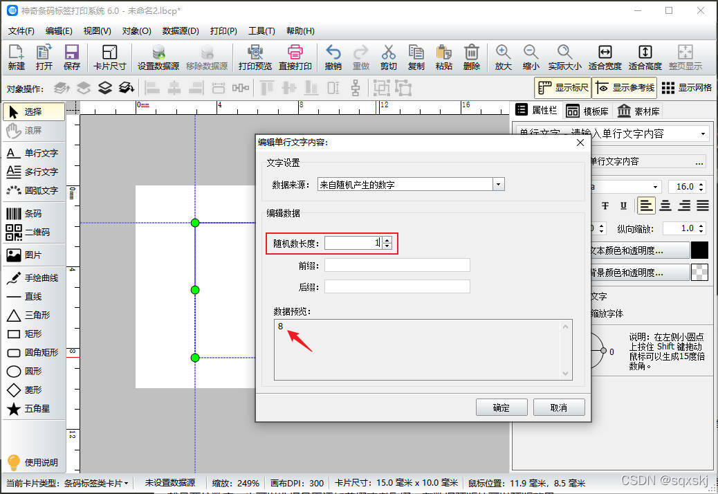 打开条码软件,新建一个标签并设置标签的尺寸,标签的尺寸要和打印的标签纸的尺寸保持一致。点击软件左侧的单行文字按钮,在画布上输入文本框,在弹出的界面中选择来自随机产生的数字。