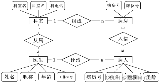其中,一个科室有多个病房,多个医生,一个病房只能属于一个科室,一个医生只属于一个科室,但可负责多个病人的诊治,一个病人的主管医生只有一个。