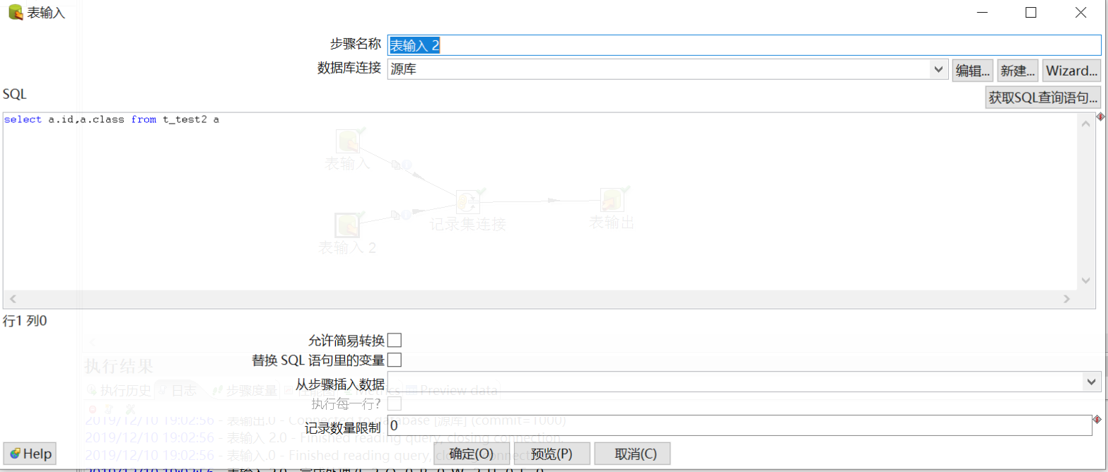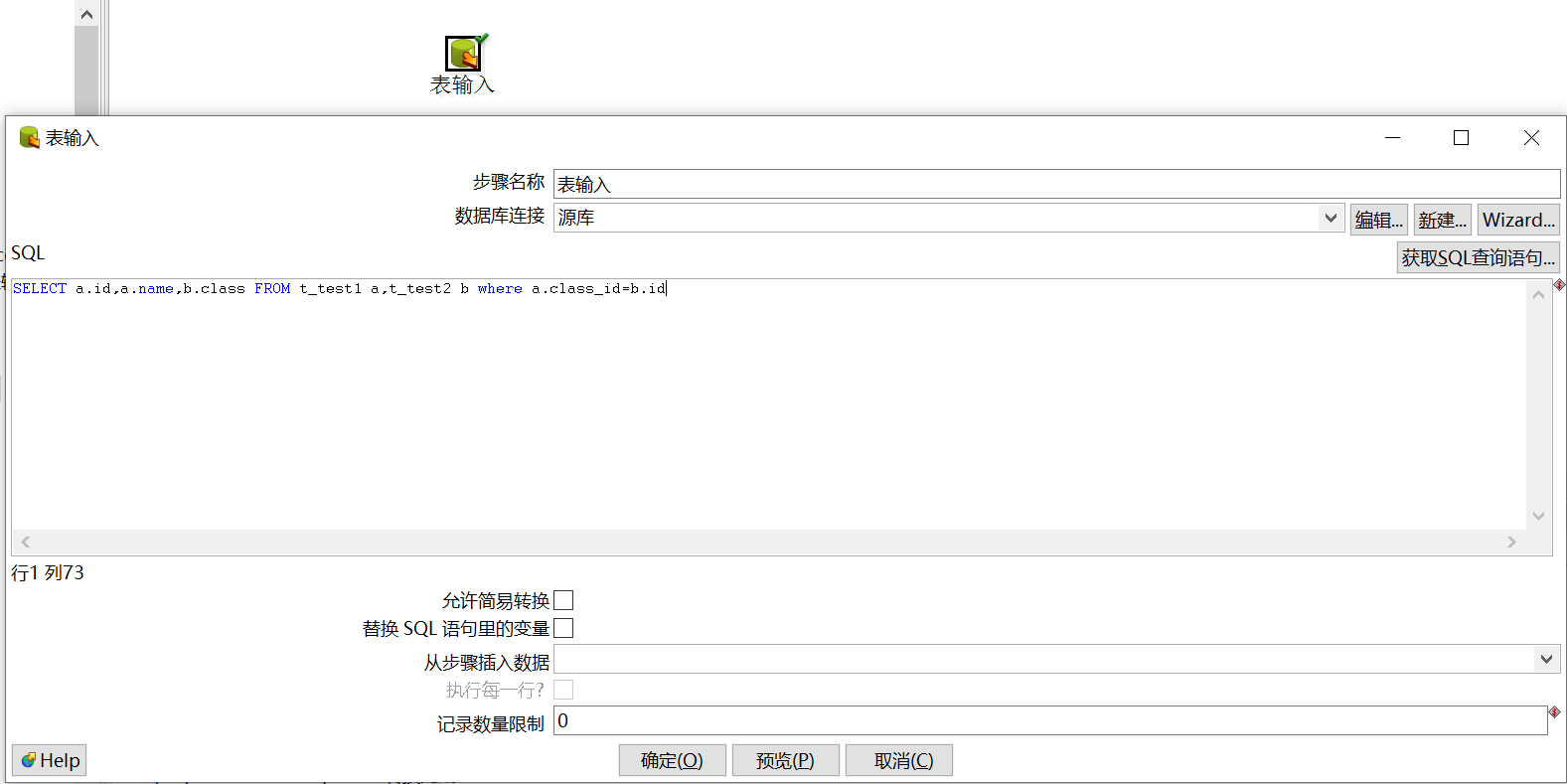 2、选择表输入,双击表输入,在sql一栏里写入关联sql语句,点击预览后,查询出相关数据,点击确定