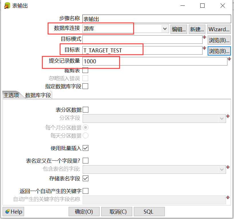 3、在核心对象中,选择表输出,按住shift键,鼠标连接表输入和表输出,双击表输出,选择数据库连接,选择目标表和提交数量点击确定