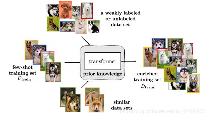 一、基于数据增强的方法。主要思路就是数据增强,通俗地讲就是扩充样本。想到数据增强,我们通常会想到平移、裁剪、翻转、加噪声等操作,但是这些操作可能在特定数据集表现很好,不具有普适性。而且设计这些操作需要对所处理的领域具有足够的了解。小样本学习所使用的数据增强方法主要有三个思路:1)只有小样本数据集:可以训练一个transformer学习样本之间的变化,然后使用该transformer对小样本数据集进行扩充;2)有小样本数据集+弱标注数据集:可以训练transformer从弱标注数据集中“挑选”样本来扩充小样本数据集;3)有小样本数据集+相似的数据集:可以训练一个GAN网络,通过学习给小样本数据集加上扰动来生成新样本。