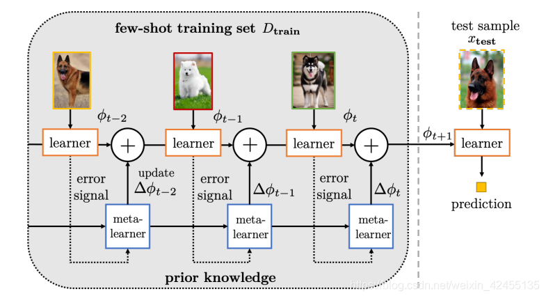 3.学习优化器。如下图所示,optimizer每次都迭代会更新上一次的模型参数,现在通过学习小样本数据集中每个迭代的更新值,从而应用在新的测试数据上。