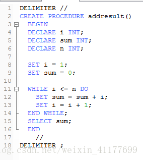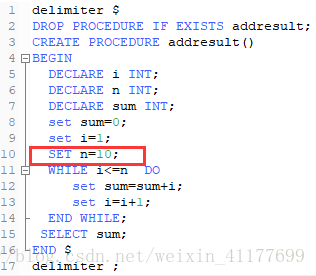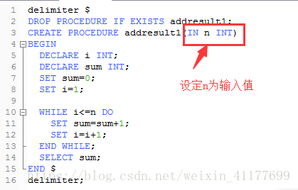 在这里需要注意的是,MySQL存储过程只能改名字和定义,不能改里面的内容。要删了重新建。所以这里选择重新建立一个addresult1过程,调用后输入n,查看打印结果。