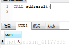 先使用MySQL语句创建存储过程,再使用call语句调用这一存储过程查看结果,可以看到由于未输入n的值,sum结果为0。