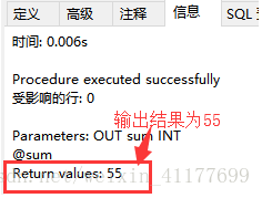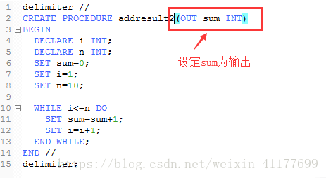 将3中存储过程中的“in n int”修改为“out sum int”,并在存储过程中设定n默认值为10。