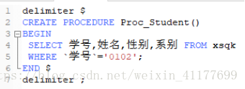 DELIMITER //CREATE PROCEDURE myproc(OUT s int)BEGINSELECT COUNT(*) INTO s FROM students;END//