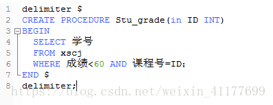 8.创建一存储过程Stu_grade,通过读取某门课的编号,求出不及格的学生的学号。