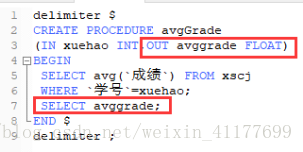 在创建存储过程时,设定学号为输入,平均成绩为输出,且因为平均成绩可能出现小数,所以设定其数据类型为float。通过select语句将平均分以参数形式返回。