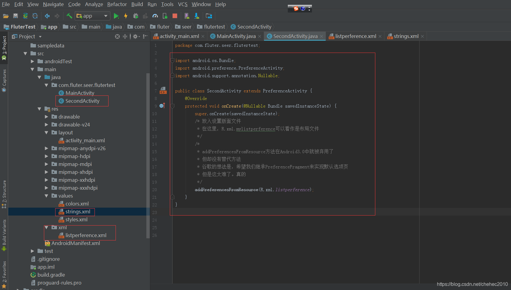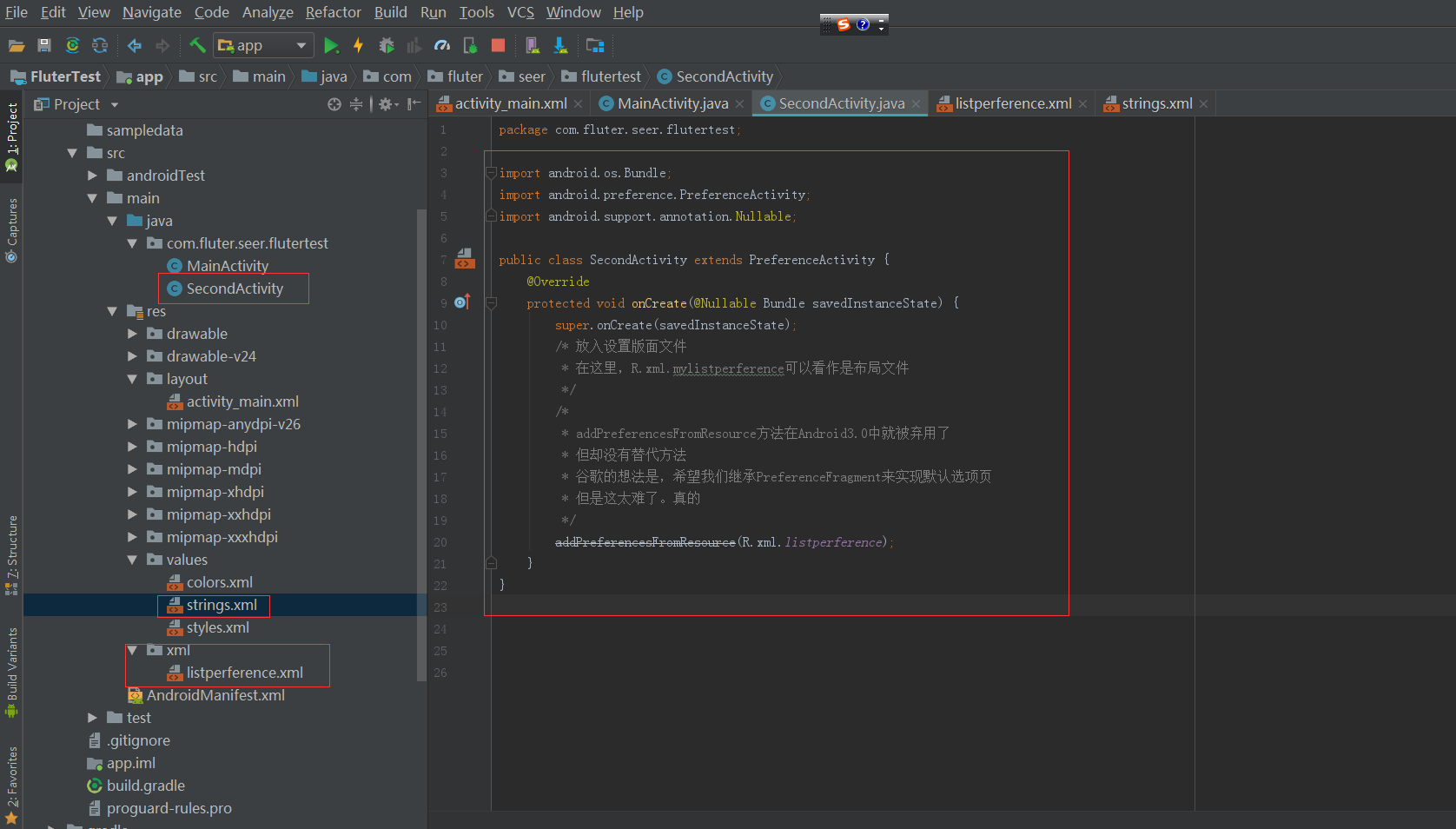 import android.support.annotation.Nullable;public class SecondActivity extends PreferenceActivity {@Overrideprotected void onCreate(@Nullable Bundle savedInstanceState) {super.onCreate(savedInstanceState);/* 放入设置版面文件* 在这里,R.xml.mylistperference可以看作是布局文件*//** addPreferencesFromResource方法在Android3.0中就被弃用了* 但却没有替代方法* 谷歌的想法是,希望我们继承PreferenceFragment来实现默认选项页* 但是这太难了。真的*/addPreferencesFromResource(R.xml.listperference);}