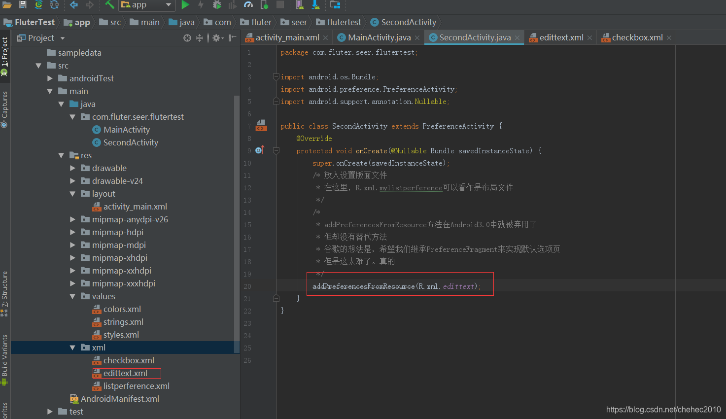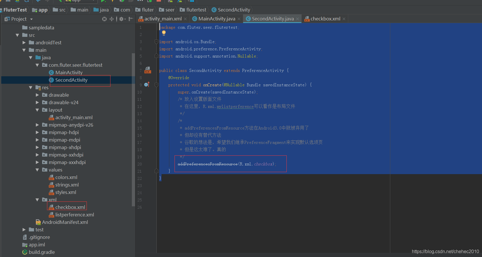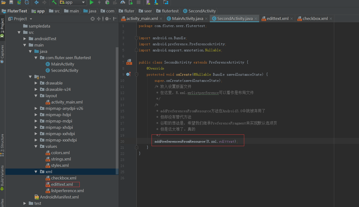 import android.support.annotation.Nullable;public class SecondActivity extends PreferenceActivity {@Overrideprotected void onCreate(@Nullable Bundle savedInstanceState) {super.onCreate(savedInstanceState);/* 放入设置版面文件* 在这里,R.xml.mylistperference可以看作是布局文件*//** addPreferencesFromResource方法在Android3.0中就被弃用了* 但却没有替代方法* 谷歌的想法是,希望我们继承PreferenceFragment来实现默认选项页* 但是这太难了。真的*/addPreferencesFromResource(R.xml.checkbox);}