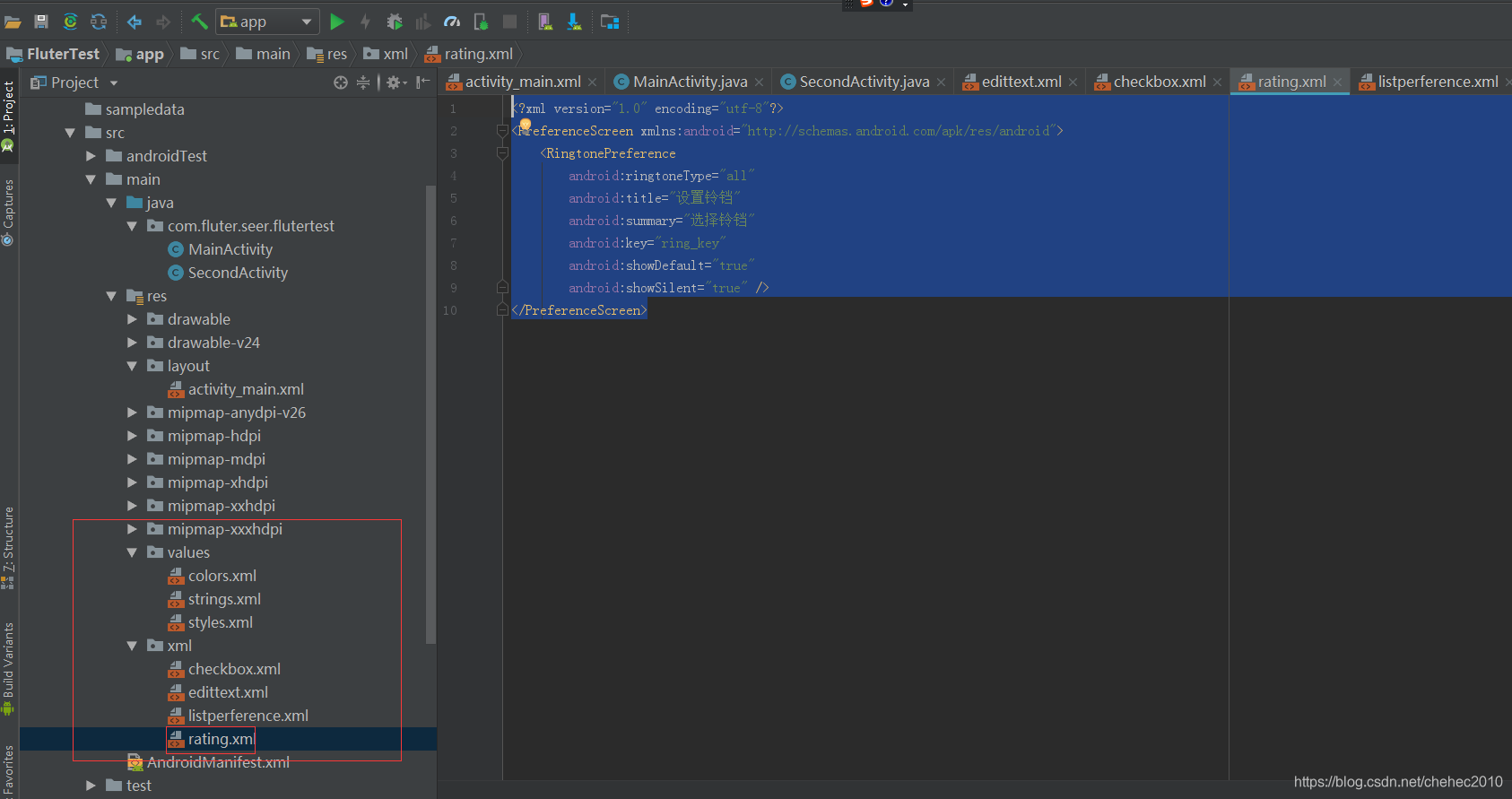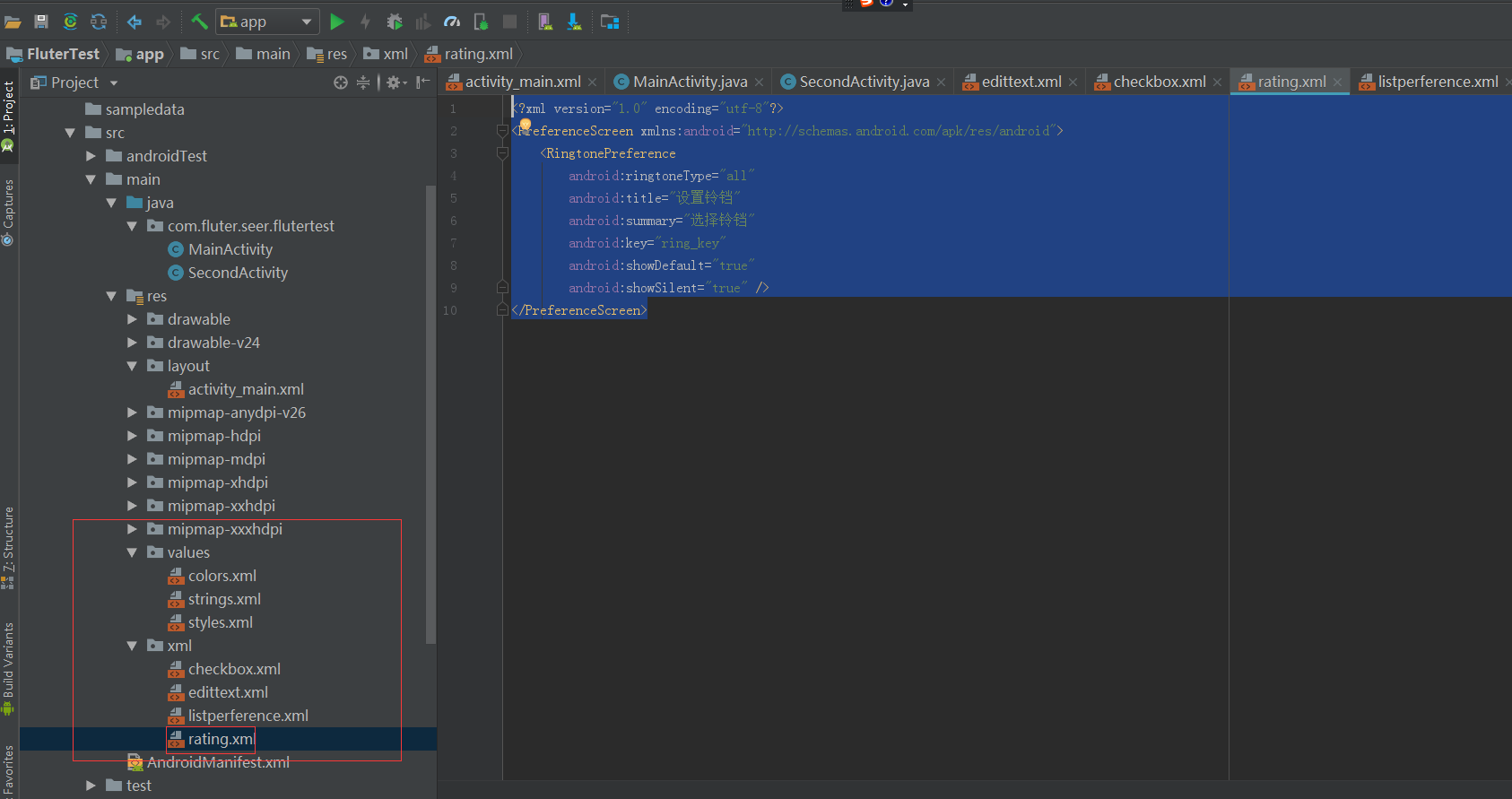 android:entries: 设置的内容是我们在设置时看到的内容android:entryValues:保存在preferences.xml中的值其余属性同上。使用如下: