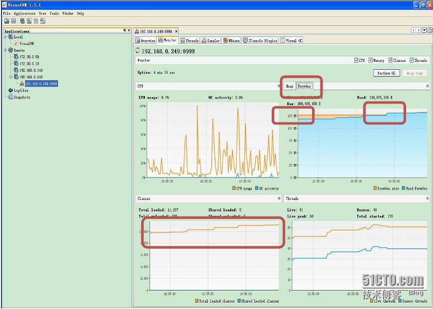 在应用服务器将此文件下载到jvisual vm所在的机器上,file--load打开此文件,如下面三图所示: