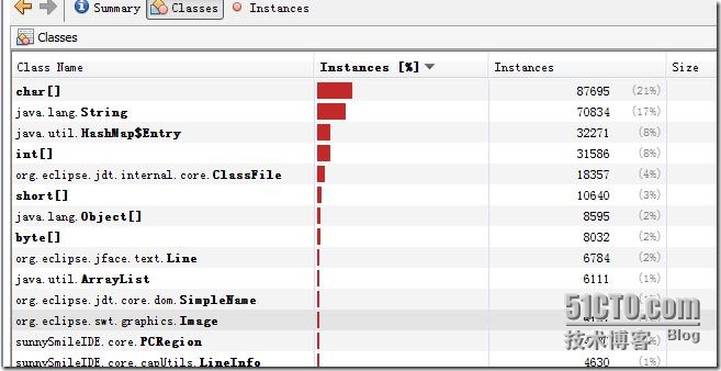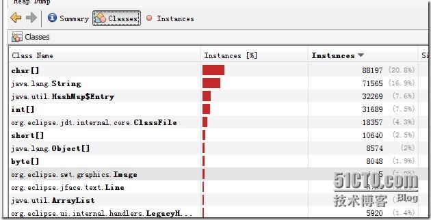 对比上面三个截图,发现似乎有个东西在急速飙升,仔细一看是这个对象:org.eclipse.swt.graphics.Image 在第一章图中这个还没排的上,第二次dump已经上升到5181个,第三次就是7845个了。涨速相当快,而且和任务管理器里面看到的GDI数量增涨一致,就是它了。