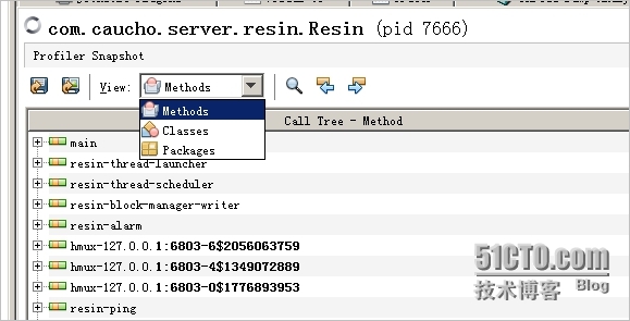 点击cpu,观察到cpu使用状况,点击snapshot,采取结果,可以选择查看方法、类或包的cpu使用情况,使用工具可以查找想要查看的方法、类或包: