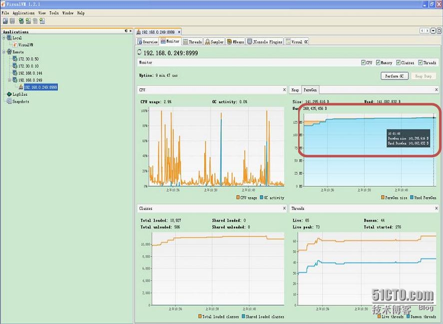 如上图所示,PermGen在程序运行一段时间后超出了我们指定的128MB,通过Classes视图看到,Java在运行的同时加载了大量的类到内存中。PermGen会存储Jar或者Class的描述信息;所以在class大量增加的同时PermGen超出了我们指定的范围。为了让应用稳定,我们需要探寻新的PermGen范围。检测时段时候后(如下图)发现PermGen在145MB左右稳定,那么我们就得到了稳定的新参数;这样PermGen内存溢出的问题得到解决。