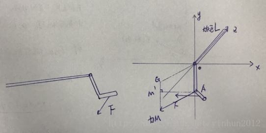 这里力矩L可以看作一个和Z轴重合的向量,力矩L的数量值等于力F作用的那一刻(那一瞬间,后面我们在微分中会讲解一瞬的意义)与力臂OA组成的平行四边形(特殊情况下比如F为切线就是矩形)的面积,上图中力M就是普通情况,求AM'和MG的乘积救得到力矩的向量的模长。