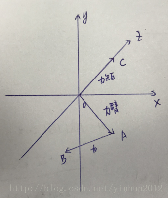 手对摇把产生OA的半径圆的切线方面力F摇动,那么会产生一种沿着Z轴的力矩L,物理上把求力矩L定义为力F 乘 力臂OA,既:L = F*OA。