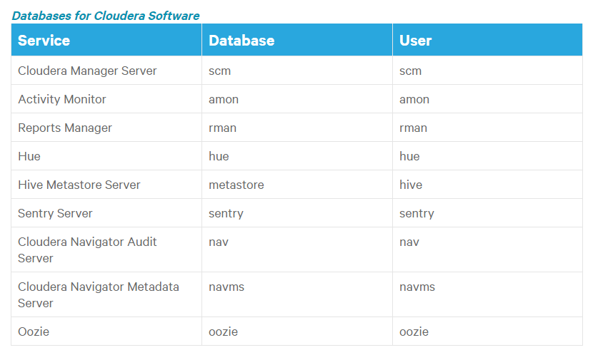 CREATE DATABASE oozie DEFAULT CHARACTER SET utf8 DEFAULT COLLATE utf8_general_ci;GRANT ALL ON scm.* TO 'scm'@'%' IDENTIFIED BY 'scm';