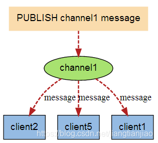 当有新消息通过 publish命令发送给频道 channel1 时, 这个消息就会被发送给订阅它的三个客户端: