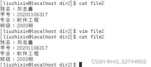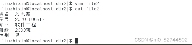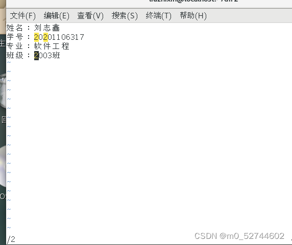 2、使用不同的命令进入插入模式,并输入内容为个人信息: