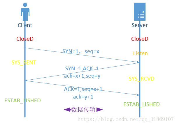 客户机主动唤醒处在Listen状态下的服务器,发送:SYN=1,seq=x表示请求同步,所发数据地址为x