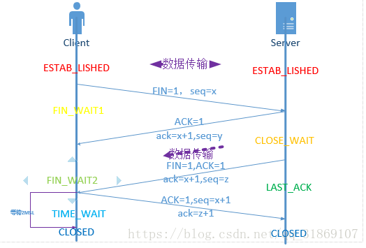 服务器接收到数据后,ACK=1,seq=y,ack=x+1,这个就不解释了吧,但需要对比握手操作的是为什么后面服务器还发送了一次,而不是将两步合为一步,因为在服务器接收到客户机的断开请求后,可能还有些数据正在传输或未传输且需要传输,因此服务器先回复客户机表示接收到你的断开请求但还不能够断开,当数据传输完成后再次回复FIN=1,ACK=1,seq=z,ack=x+1表示可以断开了,注意这时seq变为z(就是不同于上面)因为中间数据传输了,地址变化了。
