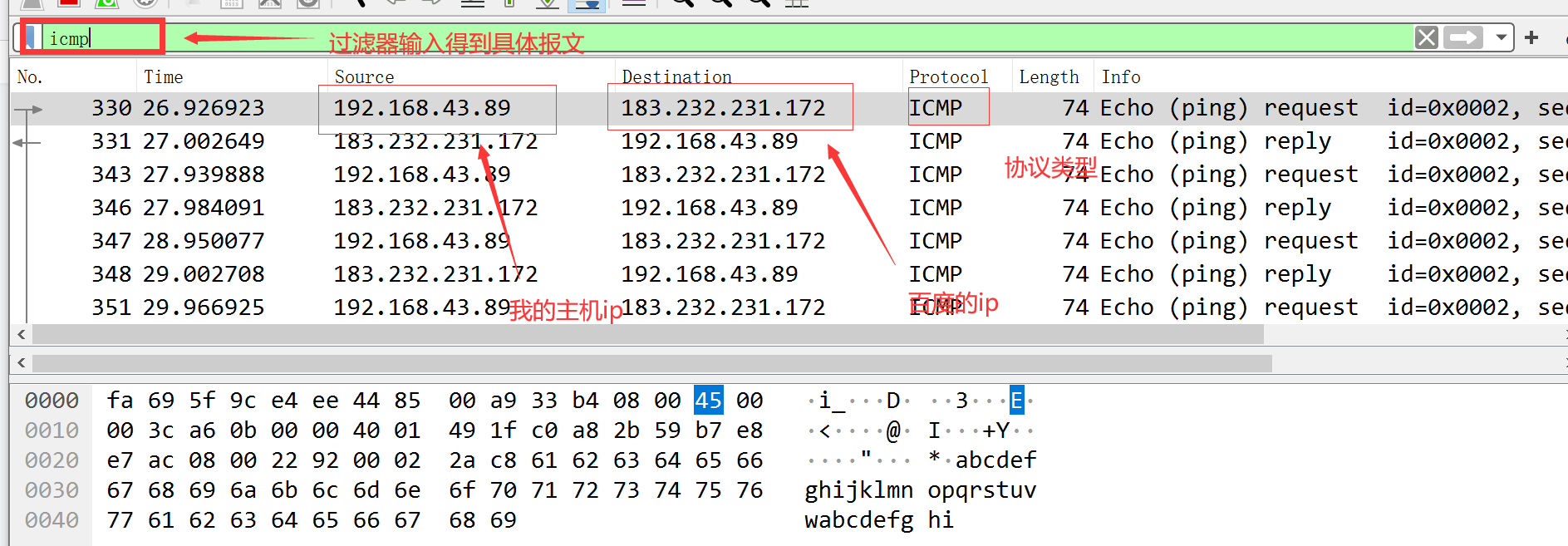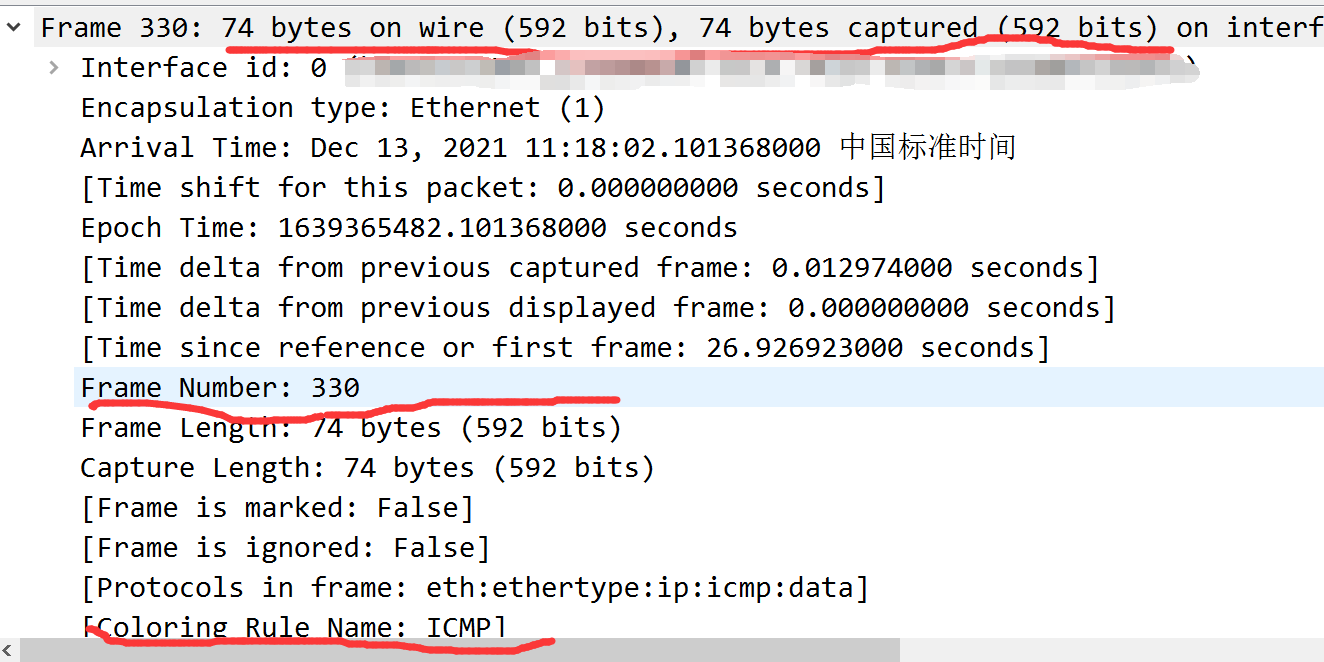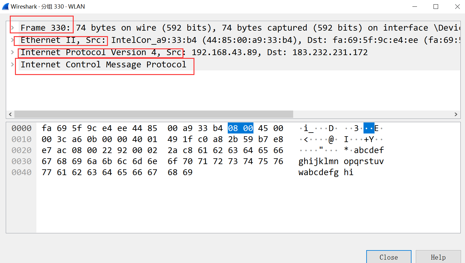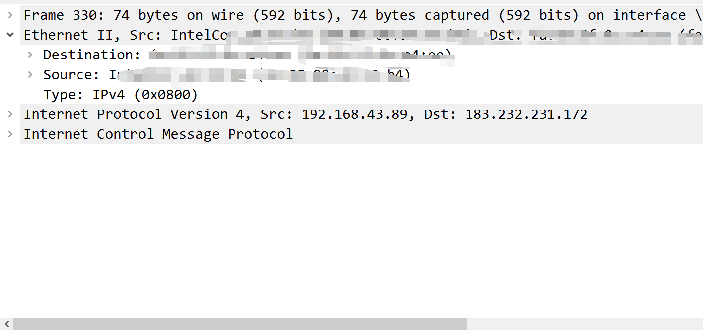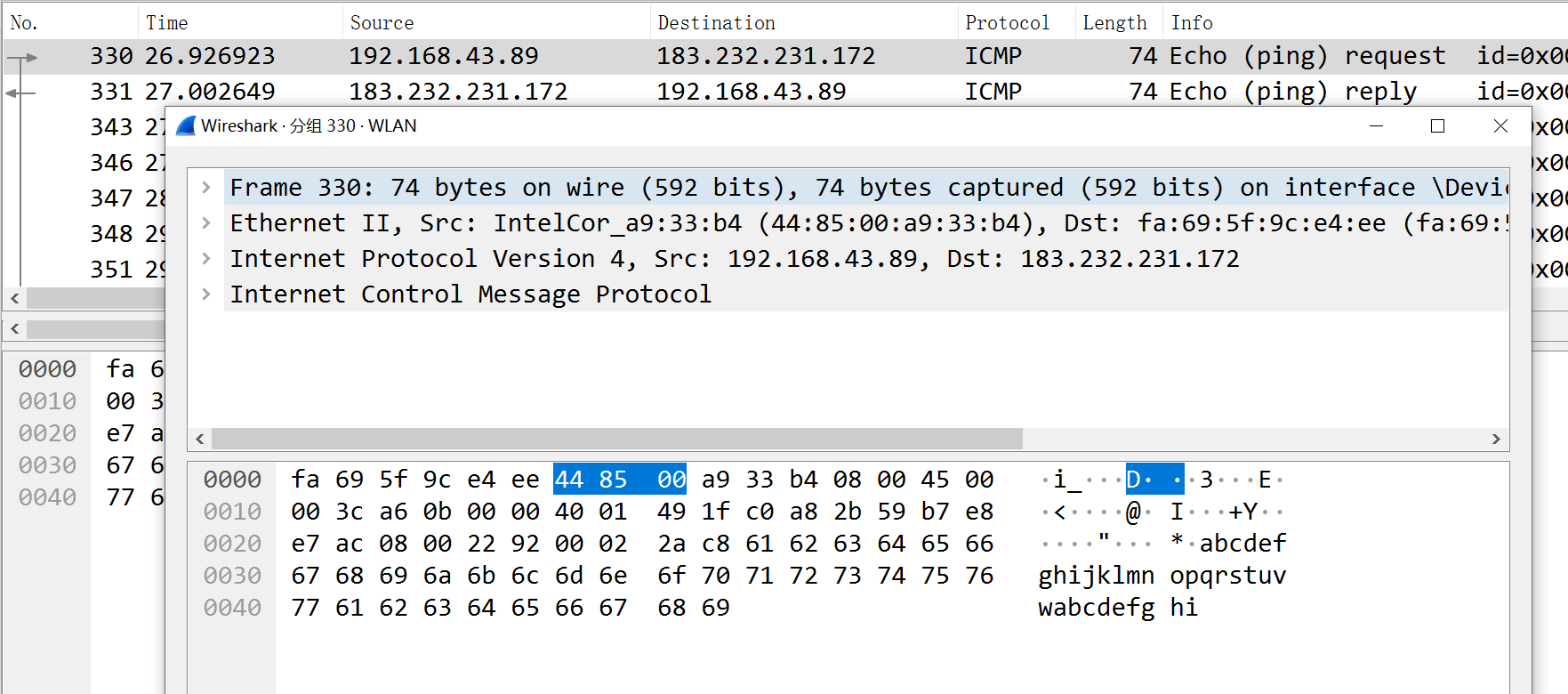 ping request数据链路层报文一共有74个字节,帧序号为330,使用的协议为icmp协议等等信息