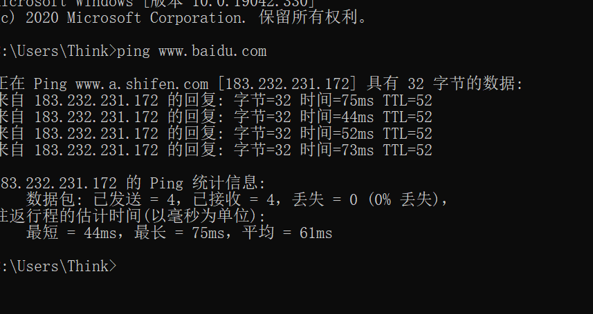 这里以我主机ping百度网站为例(在windows cmd命令框输入ping www.baidu.com)