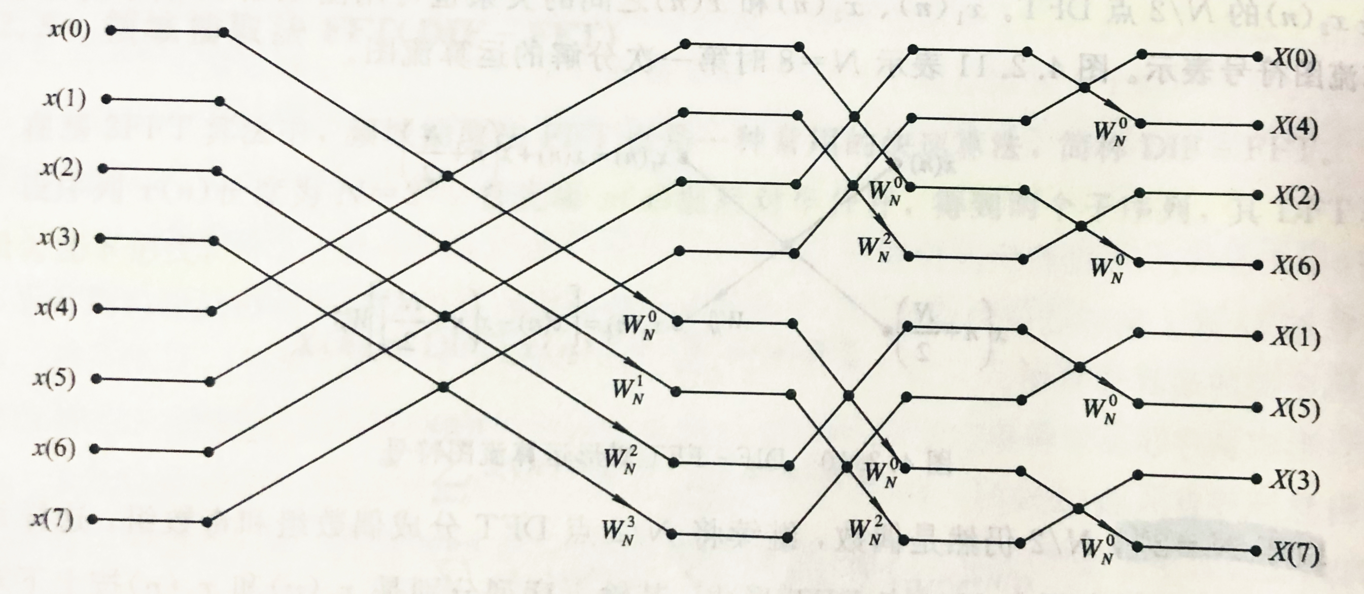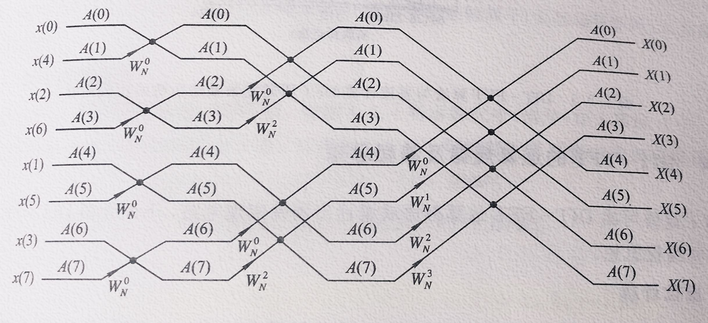 b)DIF-FFT算法与DIT-FFT算法类似,可以原位计算,共有M级运算,每级共有N/2个蝶形单元,所以两种算法的运算次数相同,不同的是DIF算法输入序列为自然序列,输出为倒序。