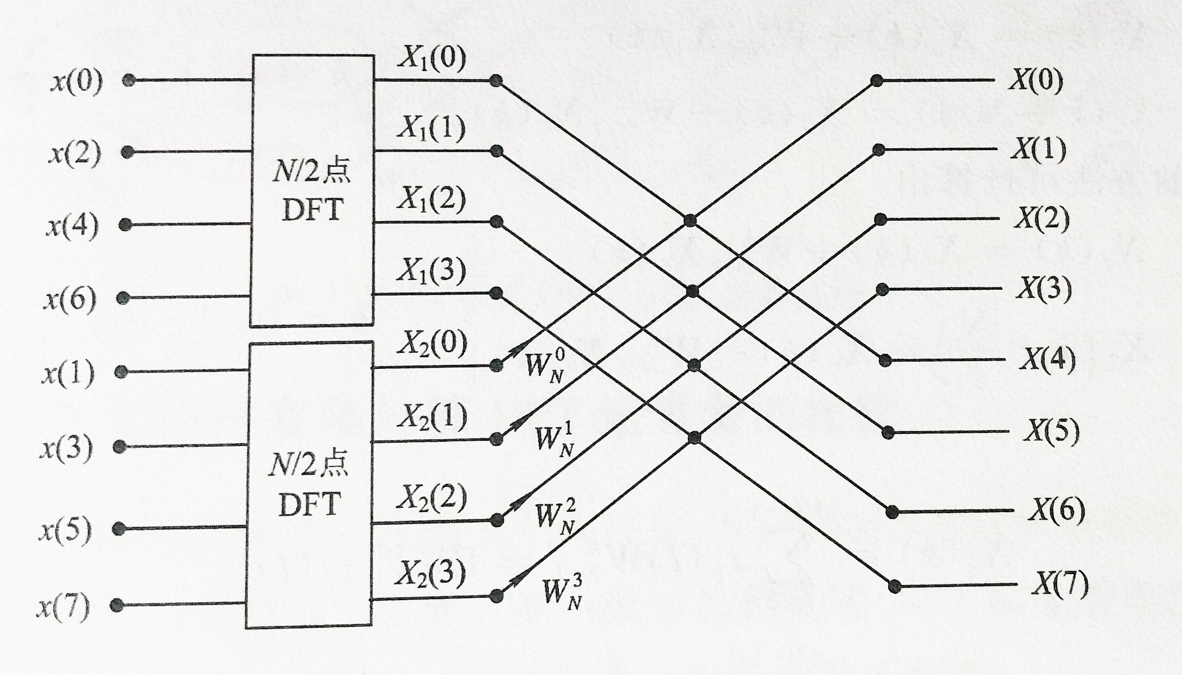 偶数组是x1(n)的N/2点DFT,奇数组则是x2(n)的N/2点DFT