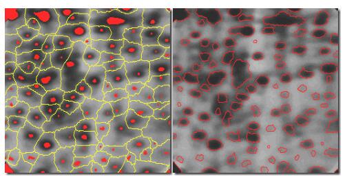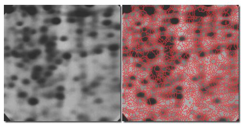 假设我们在盆地的最小值点,打一个洞,然后往盆地里面注水,并阻止两个盆地的水汇集,我们会在两个盆地的水汇集的时刻,在交接的边缘线上(也即分水岭线),建一个坝,来阻止两个盆地的水汇集成一片水域。这样图像就被分成2个像素集,一个是注水盆地像素集,一个是分水岭线像素集。