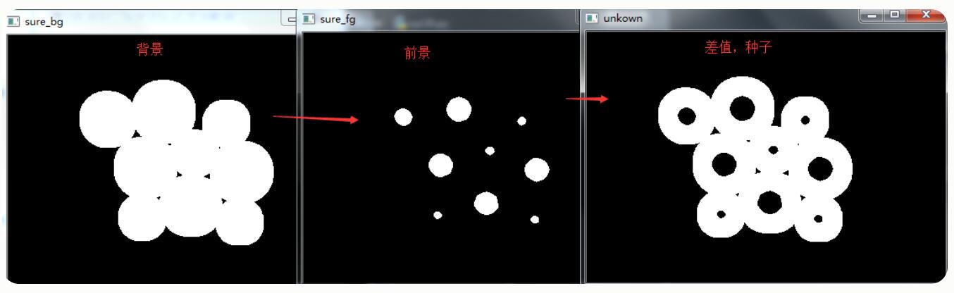 (四)在获取了背景区域和前景区域(其实前景区域是我们的种子,我们将从这里进行灌水,向四周涨水,但是这个需要在markers中表示)后,这两个区域中有未重合部分(注1)怎么办?首先确定这些区域(寻找种子)