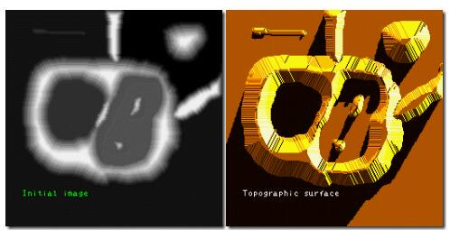 下面左边的灰度图,可以描述为右边的地形图,地形的高度是由灰度图的灰度值决定,灰度为0对应地形图的地面,灰度值最大的像素对应地形图的最高点。