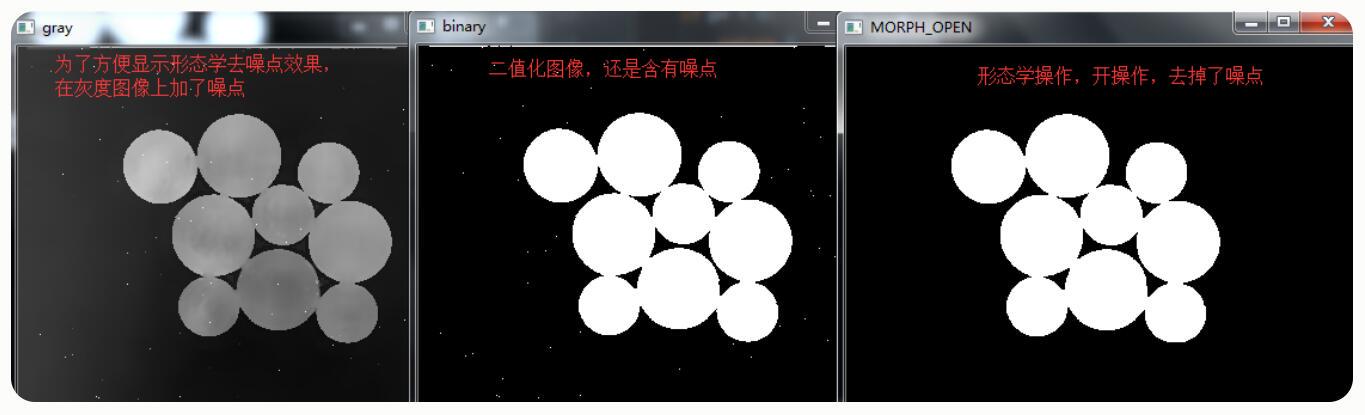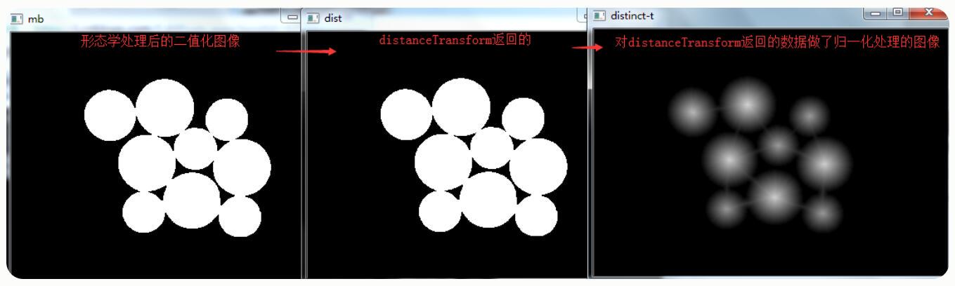 mb = cv.morphologyEx(binary,cv.MORPH_OPEN,kernel,iterations=2) #iterations连续两次开操作cv.imshow("mb", mb) #这是我们形态学开操作过滤噪点后的图像,暂时可以看做源图像#距离变换dist = cv.distanceTransform(mb,cv.DIST_L2,5) #这是我们获取的字段距离数值,对应每个像素都有,所以数组结构和图像数组一致cv.imshow("dist",dist)dist_output = cv.normalize(dist,0,1.0,cv.NORM_MINMAX) #归一化的距离图像数组cv.imshow("distinct-t",dist_output*50)