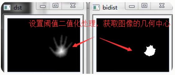 再通过设定合理的阈值对距离变换后的图像进行二值化处理,则可得到去除手指的图像(如下图“bidist”窗口图像所示),手掌重心即为该图像的几何中心。