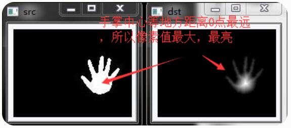 所以图像中前景目标中的像素点距离背景越远,那么距离就越大,如果我们用这个距离值替换像素值,那么新生成的图像中这个点越亮。