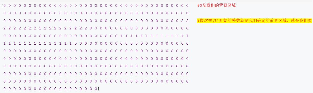 markers是我们创建的一个标签(一个与原图像大小相同,数据类型为 in32 的数组),其中包含有我们原图像的确认区域的数据(前景区域)