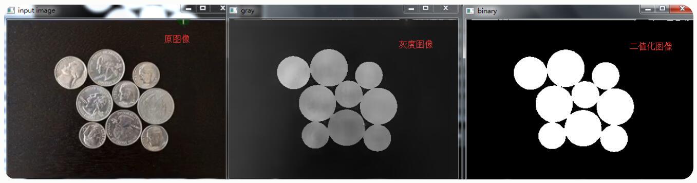 这里是求取硬币偏白色,使用THRESH_BINARY,所以我们获取对象是白色区域,是获取未重合部分,若是我们求取树叶等偏黑,需要使用THRESH_BINARY_INV,此时我们获取的对象是黑色区域,就变为了获取重合部分了。
